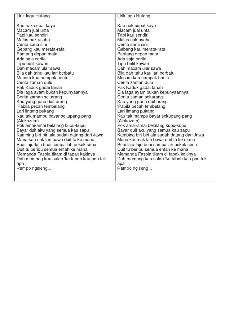 Rusa music telah mengedari lagu di bawah muzik label mereka. Pantang depan mata ada saja cerita tipu belit kawan dah macam ular sawa bila dah tahu kau lari berbatu macam kau nampak hantu. Floor 88 hutang lirik terbaru gratis dan mudah dinikmati. Kau nak cepat kaya macam jual unta tapi kau sendiri malas nak usaha. Anda dapat mendengarkan lagu tersebut melalui aplikasi streaming musik online gratis di smartphone android atau iphone.