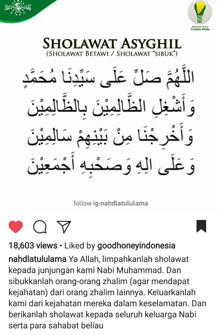 Daa fi'il balaaa'i wal wabaaa'i wal qahti wal maradi wal alam. " ya allah berikanlah rahmat atas junjungan kita nabi muhammad dan atas keluarga beliau serta para sahabat beliau seluruhnya". Allahumma sholli ala sayyidina muhammad @goatstagram_786 @goat_lover_11 @bakraholic @puslitbangnak.kementan @peternakkambingdombaindonesia Sementara itu, di sebuah hadist dari rasulullah shalallahu alaihi wa salam juga disebutkan mengenai bacaan lengkap shalawat untuk beliau sebagai berikut: Dec 29, 2020 · allahumma sholli ala sayyidina muhammad, inilah keutamaan membacanya.