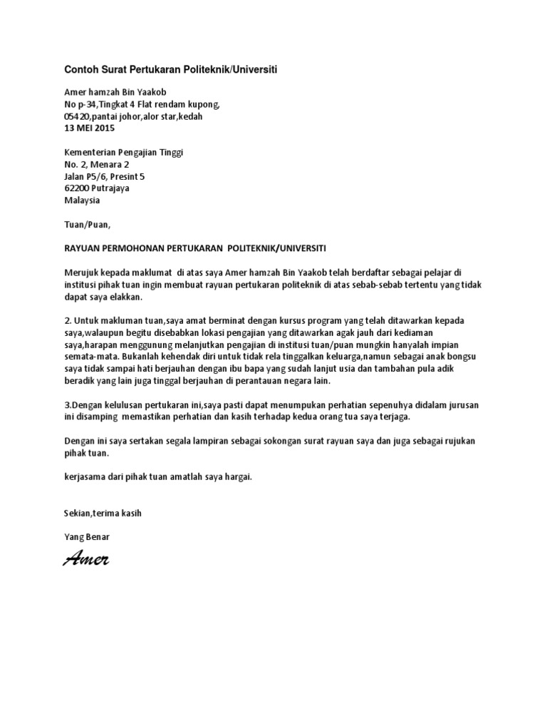 Contoh surat rasmi rayuan ke mrsm anda kurang pasti bagaimana rupa surat rasmi rayuan kemasukan mrsm tersebut, saya sediakan contoh seperti di bawah ini. Contoh surat rayuan pertukaran penempatan sekolah viral blog o surat pindah sekolah via scribd surat rayuan pertukaran via scribd contoh surat permohonan pertukaran politeknik via slideshare contoh surat kuasa wakil related keywords & suggestions via keywordhut contoh surat rasmi memohon cuti untuk tidak hadir ke via newhairstylesformen2014. Nyatakan juga alasan anda yang tersendiri, beserta salinan dokumen yang boleh menyokong lagi permohonan rayuan pertukaran anda. For more information and source, see on this link : Saya ingin membuat rayuan pertukaran agar anak saya, adriana bt anthony yang telah menamatkan persekolahan di sk kampung bakam, miri untuk ditempatkan di smk st joseph, miri.