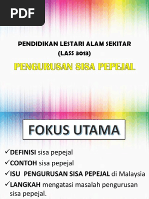 Hirarki pengurusan sisa pepejal keutamaan pengurusan sisa pepejal adalah seperti berikut: Dasar pengurusan sisa pepejal negara adalah satu langkah penambahbaikan yang strategic dalam mencapai status negara maju dan pengurusan sisa pepejal yang lebih mapan. Kajian pengurusan sisa pepejal di sarawak mengesyorkan beberapa cadangan kepada pihak berkuasa tempatan (pbt) untuk dilaksanakan bagi penyelesaian jangka panjang masalah pengurusan sisa pepejal di negeri ini. Sektor pengurusan sisa pepejal (pembinaan kemudahan sisa pepejal) (pkp) dikemas kini pada 4 jun 2021 • peraturan 16 p.u. Sisa pepejal di rumah perlu diasingkan mengikut komposisi sisa pepejal seperti berikut :